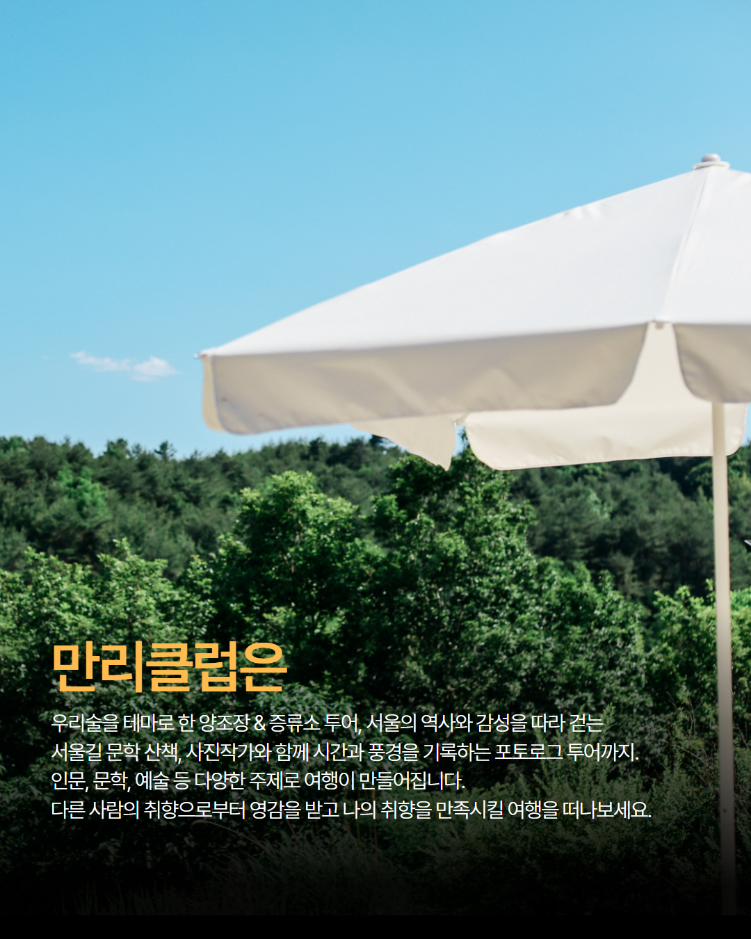 만리클럽에서는 양양술곳간, 몽트비어, 기원증류소를 다녀오는 투어를 기획하고 있습니다. 모든 술을 세 번 빚어 삼양주를 만드는 양양술곳간, 속초를 대표하는 크래프트 맥주 몽트비어, 대한민국 최초의 싱글몰트 위스키 증류소 기원까지. 여러분이 사랑하는 술이 어떻게 만들어지는지 보고 느끼며 마실 수 있습니다. 프라이빗 이동 서비스와 함께하며 운전과 이동의 걱정 없이 만리클럽과 함께 양조장 & 증류소 투어를 떠나보세요.