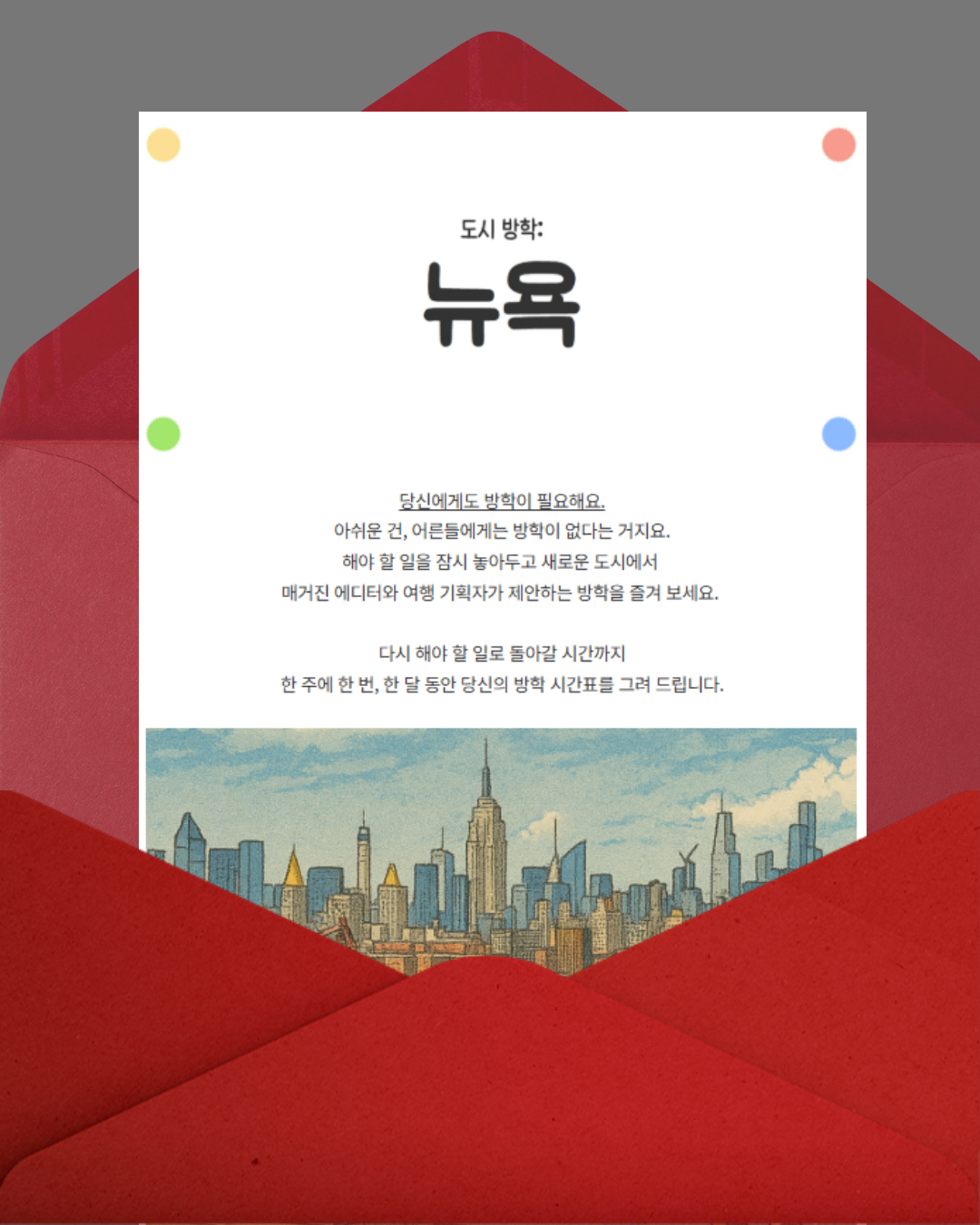 '도시 방학'은 브릭스트래블이 큐레이션 한 도시 중심의 여행 뉴스레터입니다. 세계 각국의 로컬 정보와 도시의 풍경, 생활 속 여행 감각을 담아 매월 두 편씩 메일함으로 발송됩니다. 정기 구독 월 4,900원이지만 만리클럽 회원이라면 6개월간 무료 구독이 제공됩니다. 정기 구독자와 동일한 콘텐츠와 구성으로 받아볼 수 있습니다. 출근길에 가볍게 읽고 다음 휴가 일정을 계획해보세요.